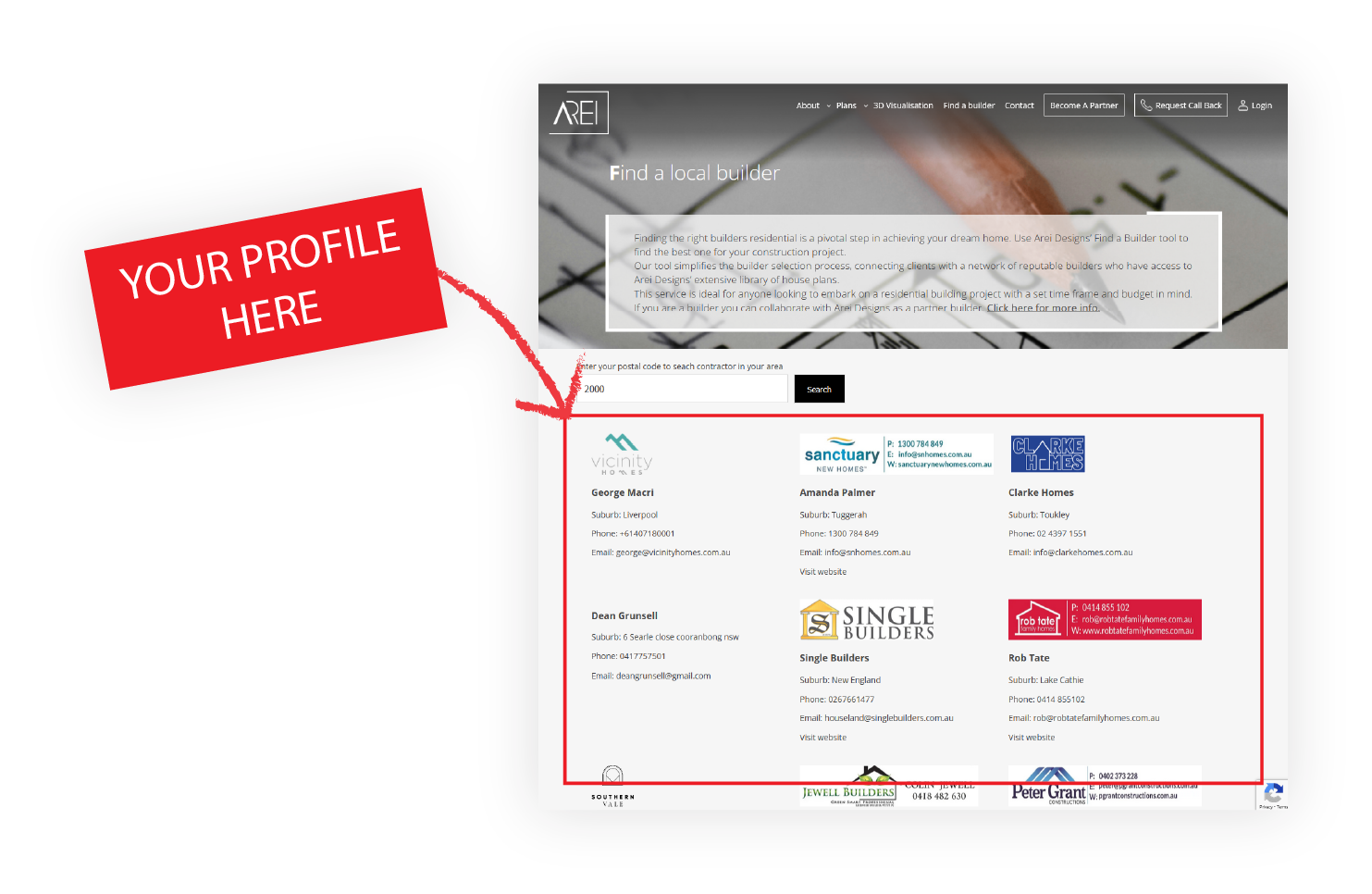 Your business publicly listed as a trusted partner on our Find A Builder page (we only have a limited number of builders per local area).